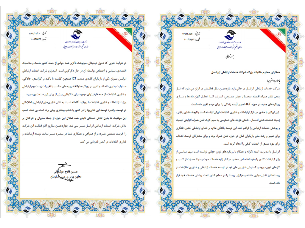 در شرایط کنونی که تحول دیجیتال، سرنوشت ناگزیر همه جوامع از جمله کشور ماست و مناسبات اقتصادی، سیاسی و اجتماعی بهواسطه آن در حال دگرگونی است، امیدوارم شرکت خدمات ارتباطی ایرانسل بهعنوان یکی از بازیگران کلیدی صنعت ICT، همچون گذشته با تاکید بر کارآمدی، چالاکی، مسئولیتپذیری، انصاف و تغییر در رویکردها و اتخاذ رویههای مناسب با تغییرات زیستبوم ارتباطی و فناوری اطلاعات، از همه ظرفیتهای موجود برای شکوفایی بیش از پیش این صنعت بهره ببرد. وزارت ارتباطات و فناوریاطلاعات با رویکرد آگاهانه نسبت به نقش فناوریهای ارتباطی و اطلاعاتی در توسعه، راهبرد توسعه این فناوریها را در کشور با شتاب بیشتری پیش برده است. بیشک کسب این موفقیتها بدون تلاش خستگیناپذیر همه فعالان این حوزه از جمله مدیران و کارکنان پر تلاش شرکت خدمات ارتباطی ایرانسل میسر نمیشد. چهاردهمین سالروز آغاز فعالیت این شرکت را فرصت مغتنمی شمرده و از همراهی و همکاری شما در پیشبرد مسیر سخت توسعه ارتباطات و فناوریاطلاعات در کشور قدردانی میکنم.»
