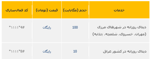 مشترکان ایرانسل میتوانند با شمارهگیری کد دستوری #۸۱۱۱۱ بستههای رایگان ۱۰ مگابایتی روزانه را برای خود فعال کنند. همینطور بستههای رایگان 100 مگابایتی روزانه نیز، با شماره گیری کد دستوری #4۱۱۱۱ برای استفاده در شهرهای مرزی مهران، خسروی، شلمچه، چذابه در دسترس مشترکان است.