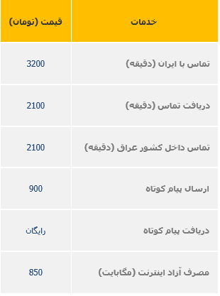 ایرانسل هزینه تماس با ایران را 3200 تومان، هزینه تماس داخل عراق و هزینه دریافت تماس را 2100 تومان در نظر گرفته است. هزینه ارسال پیامک نیز 900 تومان است، اما دریافت پیامک برای مشترکان رایگان است.