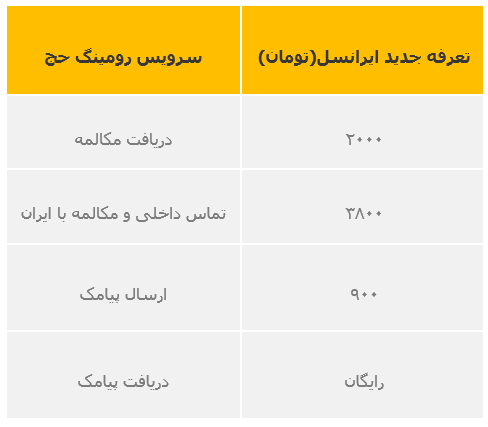 تعرفه مشترکان ایرانسل، مطابق جدول زیر برای برقراری تماس به ازای دریافت تماس ۲۰۰۰ تومان، مکالمات داخلی و تماس با ایران ۳۸۰۰ تومان و ارسال پیامک ۹۰۰ تومان خواهد بود. دریافت پیامک رایگان است.