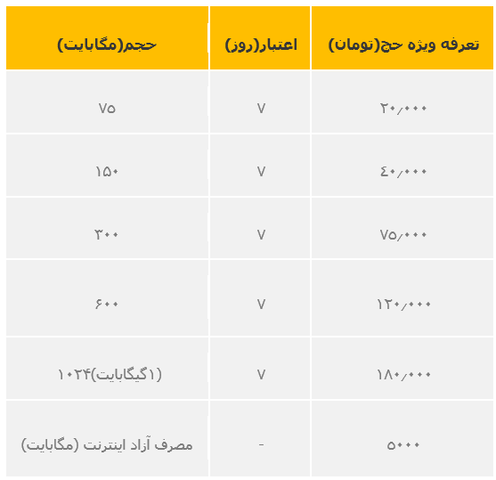 ایرانسل همچنین ۵ بسته ویژه ۷۵ تا ۱۰۲۴ مگابایتی، مطابق جدول زیر، برای حجاج در نظر گرفته است که این دسته از مشترکان ایرانسل از زمان فعالسازی بستههای ویژه حج تا یک هفته برای استفاده از آنها زمان دارند.