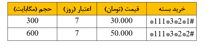 بستههای یک هفتهای ارائه شده برای زائران در حجمهای 300 و 600 مگابایت با قیمتهای 30 و 50 هزار تومان در نظر گرفته شده است. مشترکانی که قصد استفاده از بستههای 300 مگابایت را دارند میتوانند با شماره گیری کد دستوری #123111 (ستاره 111 ستاره 3 ستاره 2 ستاره 1 مربع) و مشترکانی که قصد استفاده از بستههای 600 مگابایتی را دارند میتوانند با شماره گیری کد دستوری #223111 (ستاره 111 ستاره 3 ستاره 2 ستاره 2 مربع) بستههای مدنظر خود را در اختیار داشته باشند.