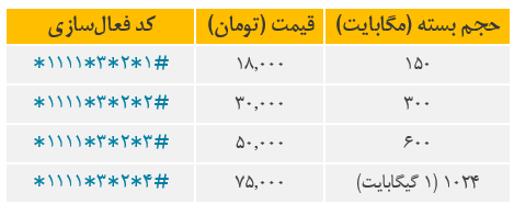بستههای ویژه یک هفتهای 150 تا 1024 مگابایت (یا 1 گیگابایت) در نظر گرفته شده مطابق جدول زیر با استفاده از شبکه اپراتورهای یاد شده در اختیار مشترکان ایرانسل است.