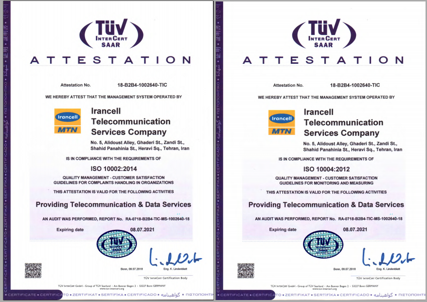 بزرگترین اپراتور دیتای ایران، ایرانسل، بعد از ممیزیهای انجام شده در یک دوره ۹ ماهه و بازبینی ۱۱۶ فرآیند مرتبط با پیگیری، رفع و حل مشکلات مشتریان، با پیروی از شعار «با هر کلیک در کنار شماییم» استاندارد10002:2014در زمینه «مدیریت شکایات مشتریان» و استاندارد 10004:2012 در حوزه «سنجش و پایش میزان رضایتمندی مشتری از خدمات پس از فروش» را از شرکت TÜV InterCert GmbH دریافت کرده است.
