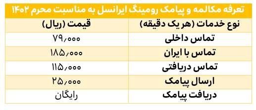 ایرانسل همچنین تعرفههای مکالمه و پیامک برای مشترکانی که در سفر به کشور عراق نیاز به استفاده بیشتر از مکالمه و پیامک را دارند، اعلام کرده است که شامل هر دقیقه تماس داخلی با هزینه ۷۹۰۰تومان، هر دقیقه تماس با ایران ۱۸هزار و ۵۰۰تومان، هر دقیقه تماس دریافتی ۱۱هزار و ۵۰۰تومان و ارسال هر پیامک ۲۵۰۰تومان است. همچنین دریافت پیامک برای مسافران کشور عراق که از سرویس رومینگ ایرانسل استفاده میکنند رایگان است.